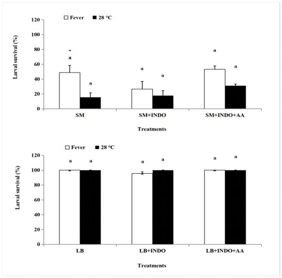 We considered the influence of fevers on larval survival (Figure 3). Nearly all control larvae survived to adulthood, as expected. Less than 20% of bacteria-infected larvae survived, which significantly increased to about 50% in larvae allowed to fever for 4 h (p < 0.05), but not for 2, 6 or 24 h. Control treatments with LB, LB+INDO and LB+INDO+AA led to approximately 100% survival with no differences between larvae that did or did not fever.