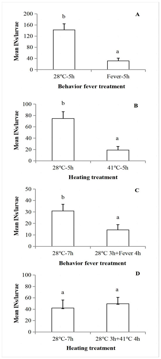 - The influence of behavior fever for 5 h on nodulation reactions was determined. Control larvae were challenged with the standard SM treatment (107 cells/mL in 1 μL/insect), then immediately transferred into the 28 °C incubator. Individuals in a second fever group were similarly challenged, then immediately transferred into the TGs. At 5 h PI, we collected the fevering larvae and counted numbers of IN/larva as described.
