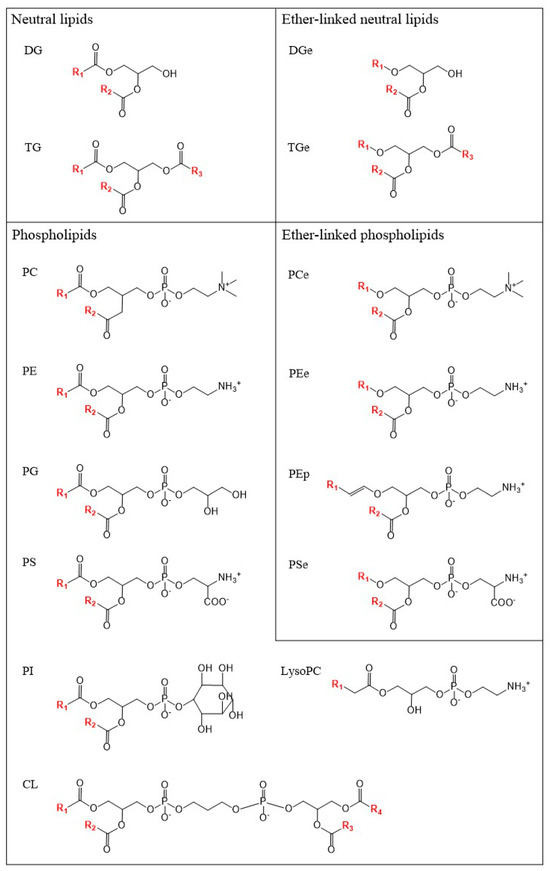 - Ivanova, P.T.; Milne, S.B.; Brown, H.A. Identification of atypical ether-linked glycerophospholipid species in macrophages by mass spectrometry. J. Lipid Res. 2010, 51, 1581–1590. [Google Scholar] [CrossRef]