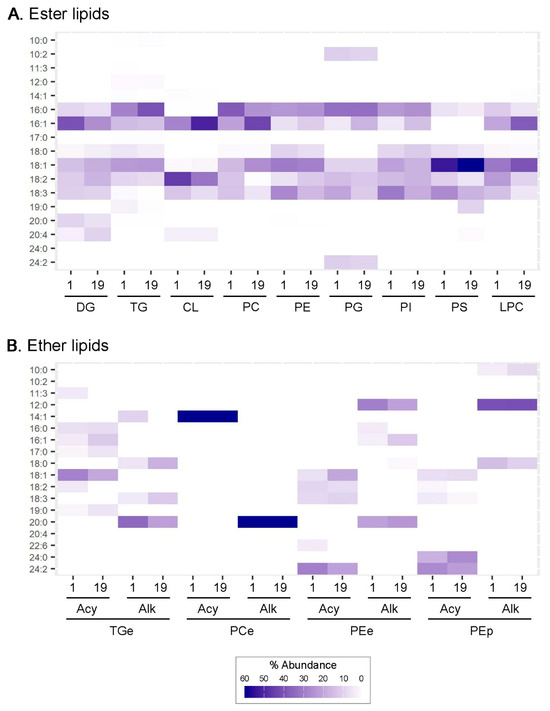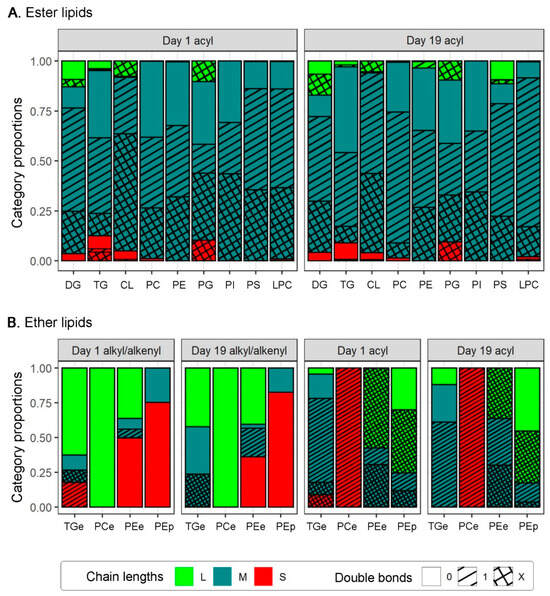Proportions of chain length and double bond categories in (A) the acyl chains of various ester lipid classes, and (B) the acyl and alkyl/alkenyl chain length and double bond categories of chain-specified ether lipids, in Day 1 and Day 19 males. Generally, the proportions were based on >8 chain-specified lipid species per class but those for PCe and PEp were only based on 1 and 7, respectively.