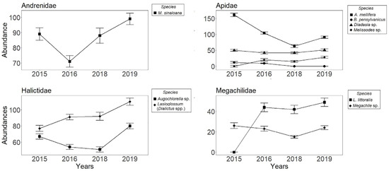 Abundance of bees (±SE) collected in pan traps and grouped by family in Cadereyta de Montes, Querétaro, México. Data from monthly sampling across four years: 2015, 2016, 2018, and 2019.
