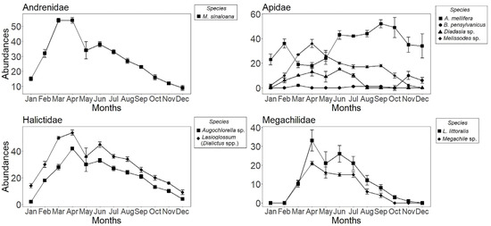 Abundance of bees (±SE) per month of capture in Cadereyta de Montes, Querétaro, Mexico. Species are shown by family. Data from data monthly sampling across four years: 2015, 2016, 2018 and 2019.