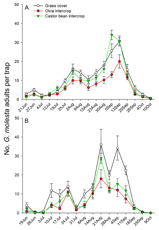 Two peaks of G. molesta activity were observed in 2018, a small peak in early August and a larger one in early September (Figure 2A), whereas in 2019, there were two small peaks in July and two larger ones in late August/early September (Figure 2B). Total catches of G. molesta males in 2018 were significantly lower in the okra intercrop (mean ± SE = 110.4 ± 8.4) than in either the grass cover (mean ± SE = 179.4 ± 8.9) or castor bean (mean ± SE = 165.6 ± 8.8) treatments (F2,4 = 17.40, p < 0.001), and in 2019, catches were lower in both the okra (mean ± SE = 88.4 ± 18.5) and castor bean (mean ± SE = 111.0 ± 11.0) treatments than in the grass cover control (mean ± SE = 182.6 ± 26.4) (F2,4 = 9.07, p = 0.004).