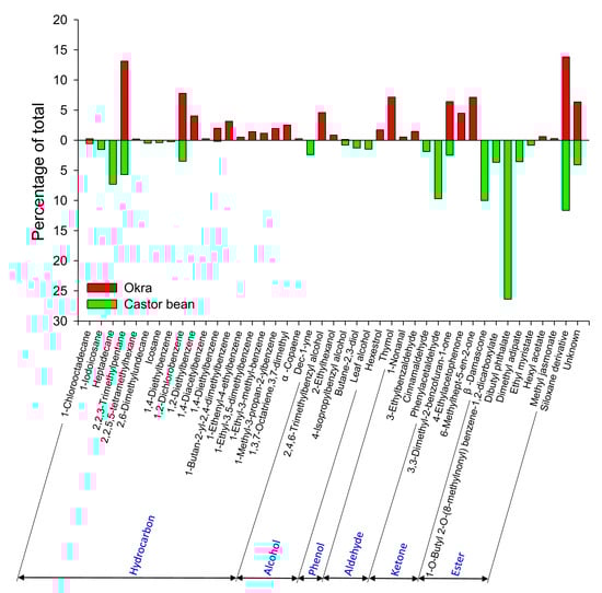 Relative proportions of volatile organic compounds identified in headspace from okra and castor bean as determined by GC/MS analysis.