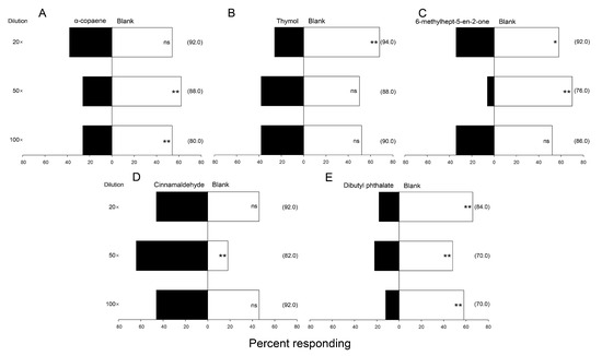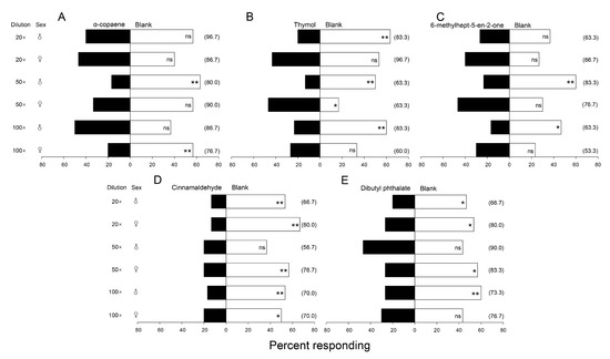 Percentages of male and female Grapholita molesta adults (n = 30 moths per trial, tested singly) responding to three volatiles from okra: α-copaene (A), thymol (B), and 6-methylhept-5-en-2-one (C), and two volatiles from castor bean: cinnamaldehyde (D) and dibutyl phthalate (E), when presented versus clean air in a Y-tube olfactometer (chi-square test, *: p ≤ 0.05, **: p ≤ 0.01). Each compound was tested at three dilutions; numbers in parentheses indicate the percentage of moths responding in each test.