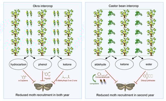 This study used field observations to demonstrate that intercropping okra in a pear orchard reduced pheromone trap catches of Grapholita molesta in two years, whereas intercropping with castor bean reduced them in one year, relative to natural grass cover. GC-MS assays showed that hydrocarbons, phenols, and ketones predominated in the volatiles emitted from okra, whereas aldehydes, ketones, and esters were the most abundant volatiles emitted from castor bean. Five of these compounds exhibited repellency to G. molesta in olfactometry assays, especially cinnamaldehyde, dibutyl phthalate, and thymol; the former also served as an attractant for the egg parasitoid Trichogamma dendrolimi, which is often used in augmentation biocontrol of the moth.