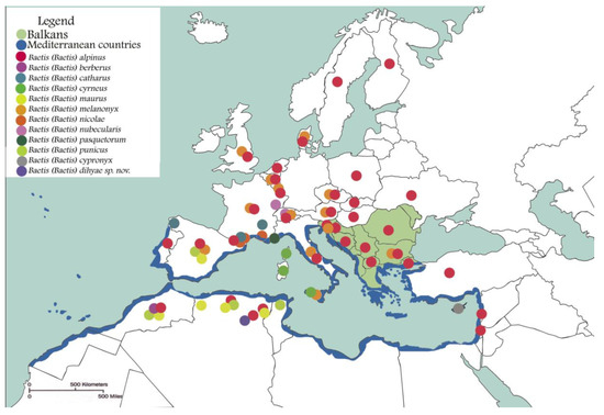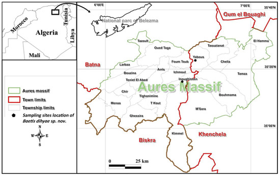 Dambri, B.M.; Godunko, R.J.; Benhadji, N. Baetidae (Insecta: Ephemeroptera) of Aurès Mountains (Algeria): A New Species of the Baetis alpinus Species Group, with Notes on Baetis Laech, 1815 Biogeography within Maghreb. Insects 2023, 14, 899. https://doi.org/10.3390/insects14110899