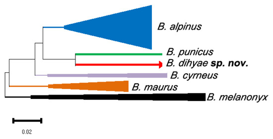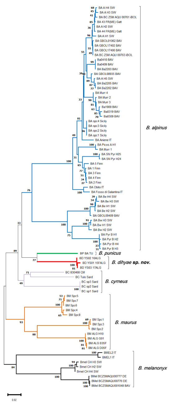 | B. dihyae sp. nov. | B. punicus | B. cyrneus | B. maurus | B. alpinus | B. melanonyx | |