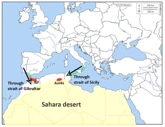 - Cosson, J.-F.; Hutterer, R.; Libois, R.; Sarà, M.; Taberlet, P.; Vogel, P. Phylogeographical footprints of the Strait of Gibraltar and Quaternary climatic fluctuations in the Western Mediterranean: A case study with the greater white-toothed shrew, Crocidura russula (Mammalia: Soricidae). Mol. Ecol. 2005, 14, 1151–1162. [Google Scholar] [CrossRef]
