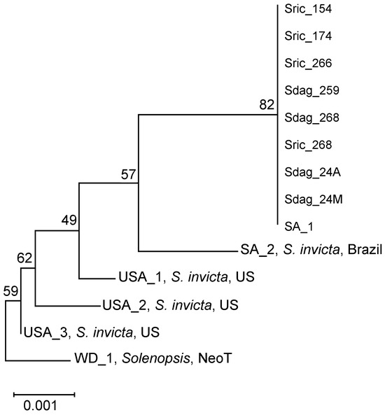 We obtained for the first time the sequence of the K. solenopsae SSU rRNA gene from the social parasite S. daguerrei (Table 2). However, further studies are needed to assess whether the microsporidium causes any type of negative effect on S. daguerrei. Based on the 760 bp alignment, which excluded gaps and missing data, all the K. solenopsae sequences found in S. richteri (host) and S. daguerrei (social parasite) were identical, showing zero differences (Table 3). Furthermore, the sequences were the same as the previously published K. solenopsae found in the S. richteri host (GenBank Accession number: AF031537, Moser et al. [16]), classified as Genotype SA_1 per Ascunce et al. [17]. Phylogenetic analyses using the p-distances revealed that the K. solenopsae variant found in S. richteri and S. daguerrei is closely related to the variants found in S. invicta from U.S. and South America (Figure 1 and Figure S1).