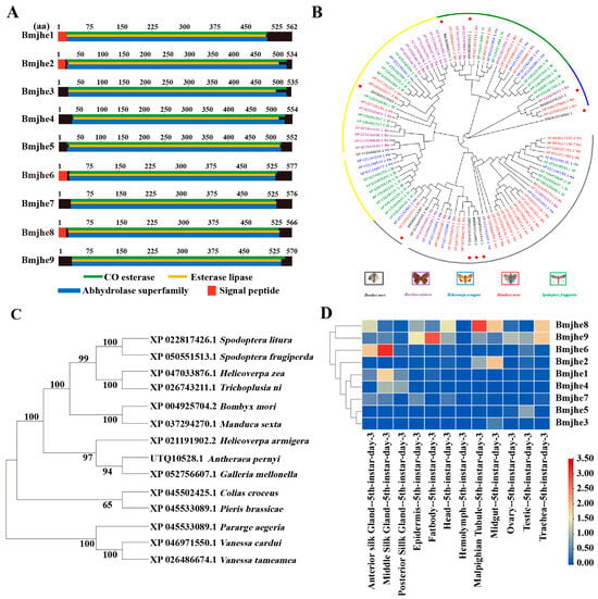 Identification of Bmjhe candidate family members and discovery of Bmjhe6. (A) Gene structure diagram of Bmjhe candidate family members. (B) Evolutionary analysis of the Bmjhe superfamily. (C) Phylogenetic analysis of Bmjhe proteins from 14 insects. (D) Microarray expression data for Bmjhe genes in various tissues of Day-3 fifth-instar silkworms.