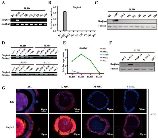 Expression and localization of Bmjhe6. (A) The mRNA expression of Bmjhe6 in the various tissues of Day-3 fifth-instar silkworms using RT-PCR, (B) qRT-PCR, and (C) WB. (D) The mRNA expression of Bmjhe6 in different regions silk glands of fifth-instar silkworms using RT-PCR and (E) qRT-PCR. (F) The protein expression of Bmjhe6 in tissues of Day-3 fifth-instar silkworms using WB. (G) Protein localization of Bmjhe6 in different regions of the silk gland of Day-3 fifth-instar silkworms. Hd: Head; Fb: fat body; Mg: midgut; Ep: epidermis; Gd: gonad; Mp: Malpighian tubule; Hm: Hemolymph; 5L1-7D: Day-1–7 fifth instar.