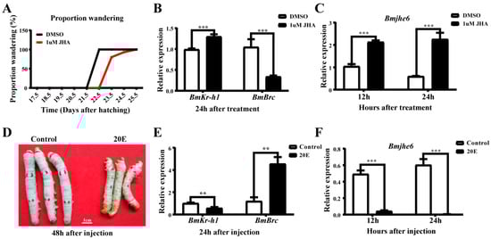 Effects of JHA and 20E on growth of silkworm and Bmjhe6 expression of silk gland. (A) Larval wandering stage after JHA treatment. (B) Expression of Bmkr-h1 and BmBrc at 24 h after JHA treatment. (C) Expression of Bmjhe6 at 12 h and 24 h after JHA treatment. (D) Observation of larval morphology 24 h after 20E treatment. (E) Expression of Bmkr-h1 and BmBrc at 24 h after 20E treatment. (F) Expression of Bmjhe6 at 12 h and 24 h after 20E treatment. Results are expressed as means ± S.D. of three independent experiments. ** p < 0.01; *** p < 0.001.