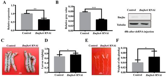 Effect of RNAi Bmjhe6 on the growth of silkworm and silk gland. (A) The mRNA expression and (B) protein expression of Bmjhe6 after RNAi 48 h. (C) Larvae size and (D) weight in Day-3 fifth-instar Bmjhe6 RNAi silkworms. (E) Silk gland size and (F) weight in Day-3 fifth-instar Bmjhe6 RNAi silkworms. Results are expressed as means ± S.D. of three independent experiments. * p < 0.05; ** p < 0.01; *** p < 0.001.