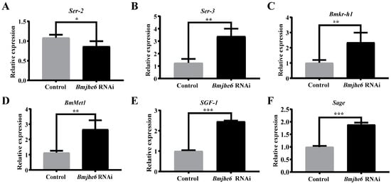 The mRNA expression of related genes in the Bmjhe6 RNAi in A-MSG, including sericin genes (A) Ser2, (B) Ser3, key genes in the JH synthesis pathway, (C) BmKr-h1, (D) BmMet1, and transcription factors (E) SGF1 and (F) Sage. Results are expressed as means ± S.D. of three independent experiments. * p < 0.05; ** p < 0.01; *** p < 0.001.