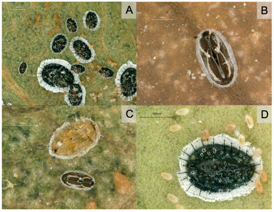 Aleurocanthus spiniferus from French outbreak: (A), larvae and puparia; (B), first immature stage; (C), first and second immature stages; (D), puparium (last immature stage) and eggs. (A–D) photo J.-C.S.