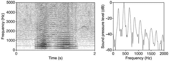 Figure 1. Example spectrogram and power spectrum of the wing buzzing of Bombus pratorum. The spectrogram was generated in Praat version 6.2.14 using a Gaussian window shape, a window length of 0.03 s, 1000 time steps, 250 frequency steps, and a dynamic range of 70 dB. The power spectrum was generated by selecting a portion of 0.01 s of the signal where the frequency components contain the highest energy.
