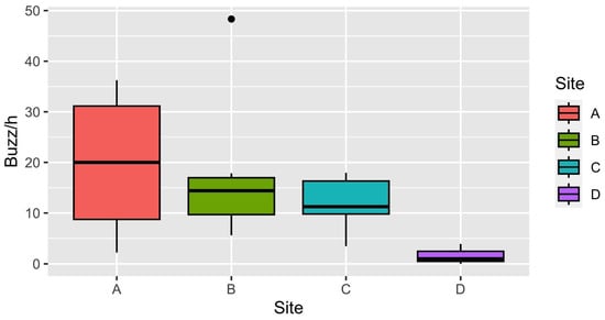 Boxplots of number of buzzes per hour of acoustic sensors calculated per site, considering only the recordings between 10:00 and 16:00 in April and June. Horizontal lines represent median rank of values, boxes indicate 25th and 75th percentiles, whiskers correspond to minimum and maximum values, and dots represent outliers.