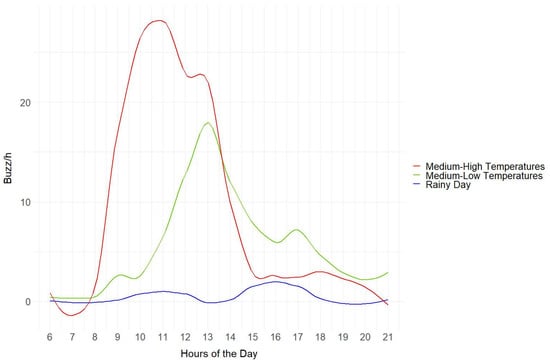 On days with medium-low temperatures, the buzzes were more concentrated in the central hours of the day (11:00–17:00) when temperatures rose to 17.6 °C. In contrast, on days characterised by medium-to-high temperatures, we recorded a higher number of buzzes, but earlier in the day (8:00–15:00). Early afternoon buzzes then started to decrease (from 13:00) because it became too hot (30.4 °C) (Figure 5). On rainy days, buzzes were close to zero (Figure 5).