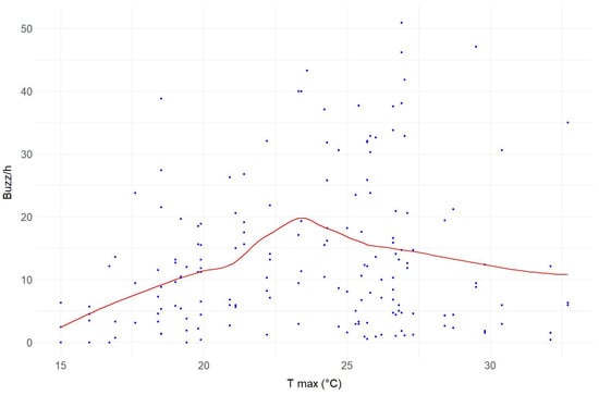 Distribution of buzz/h over the temperature ranges recorded at Site A during the two months of sampling. The y-axis represents the buzz/h of the four devices at the site, and the x-axis represents the maximum temperature recorded during the reference period. The red line is the trend line obtained by the “loess” method.