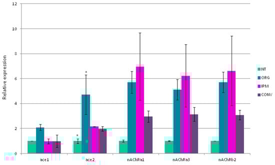 Level of expression of insecticide targets. Gene expression was normalized using the expression of three reference genes (actin, EF1 and GAPDH) and shown as fold-change relative to the expression of earwigs collected in the untreated orchard. ace1; ace2: acetylcholinesterase target of organophosphates and carbamates; nAChRα1; nAChRα3, nAChRβ2: nicotinic acetylcholine receptor (three subunits) target of neonicotinoids and spinosad. Data are mean values of three biological replicates ± SEM, and comparison between samples were performed using One-way ANOVA followed by Tukey test (* p < 0.05) indicating significant difference between earwigs from non-treated orchard versus treated orchards.