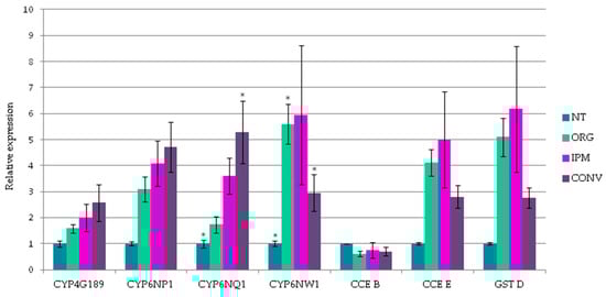Level of expression of detoxification genes. Gene expression was normalized using the expression of three reference genes (actin, EF1 and GAPDH) and shown as fold-change relative to the expression of earwigs collected in no treated orchard. CYP (cytochromes P450); CCE (carboxylesterases); GST (glutathione-S-transferases). Data are mean values of three biological replicates ± SEM, comparison between samples was performed using one-way ANOVA followed by Tukey test (* p < 0.05), indicating significant difference between earwigs from non-treated orchards versus treated orchards.