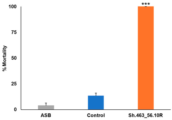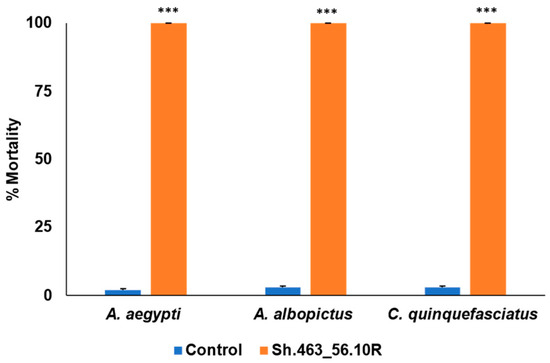 Comparable results were observed in the ATSB trials conducted in Bangkok, Thailand, where Sh.463_56.10R yeast that had been shipped from Indiana to Bangkok induced 100% morbidity in A. aegypti adult female mosquitoes, while the negative control group showed only 1% mortality (Figure 6). The results revealed a significant difference in mortality rates between the experimental group treated with Sh.463_56.10R yeast and the negative control group (p < 0.001). As observed in Trinidad, mosquitoes treated with Sh.463_56.10R yeast died within 24–48 h of treatment. Combined, these findings suggest that the Sh.463_56.10R yeast adulticide can induce high levels of Aedes and Culex mosquito mortality, making it a potential innovative biorational method for mosquito control.
