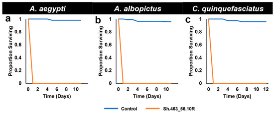 Survival following semi-field larvicide treatments. Although control RNAi yeast-treated larvae of the indicated species survived development under semi-field trial conditions in St. Augustine, Trinidad, A. aegypti (a), A. albopictus (b), and C. quinquefasciatus (c) larvae that consumed Sh.463_56.10R yeast died within one day following treatment. Results were compiled from the trial data shown in Figure 1.