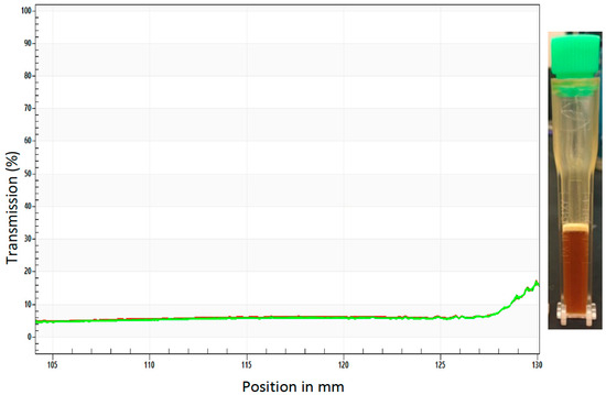 Sedimentation analysis of the yeast ATSB suspension. Uniform transmittance was detected throughout the profile of the cuvette (shown at right) during sedimentation analysis of the yeast ATSB suspension at 4000 rpm for six hours (300 profiles, 75 s intervals, light factor = 1.0, temperature = 60 °C). Each of the 300 profiles is included in the plot with a color transition from red to green for each plotted line.