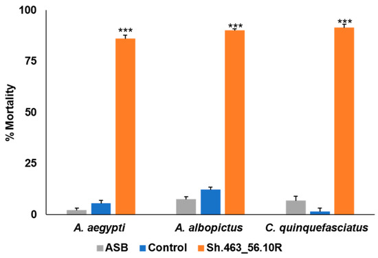 The RNAi yeast–BaitStabTM mixture was prepared and delivered to adult Aedes, Culex, and Anopheles mosquitoes using a miniature bait station sachet designed to mimic that which is being evaluated in the ongoing ATSB trials in Africa [8]. The stations were evaluated in outdoor semi-field trials conducted in St. Augustine, Trinidad. Morbidity induced by the Sh.463_56.10R yeast ATSB was examined in adult female A. aegypti, A. albopictus, and C. quinquefasciatus mosquitoes. The ATSB was marked with fluorescent dye, which was used to confirm that the mosquitoes had consumed it. Sh.463_56.10R yeast ATSB induced significant (p < 0.001) 90–100% morbidity in the semi-field trials conducted on each of these species of mosquitoes (Figure 4).