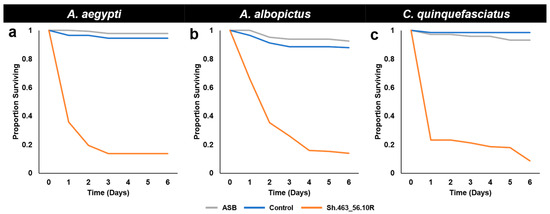 Survival following ATSB consumption in semi-field trials. Although adult females of the indicated species survived for six days following the consumption of sugar bait (ASB) or control yeast, the majority of A. aegypti (a), A. albopictus (b), and C. quinquefasciatus (c) adult female mosquitoes died within 24–48 h following the consumption of Sh.463_56.10R yeast. Results were compiled from the trial data shown in Figure 4.