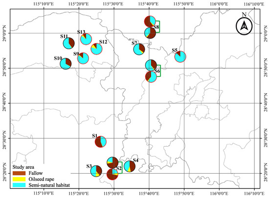 The surrounding landscape composition of focal fields at a scale of 1000 m radius was quantified using remote sensing image data. High-light map images were printed and confirmed the land use according to the ground truth during the sample period. Furthermore, ArcGIS 10.6 was used to digitize the landscape context. Using FRAGSTATS 4.2, the landscape compositions and diversity were calculated. The landscape composition includes the percentage area of oilseed rape fields, the percentage area of fallow rice fields, and the percentage area of semi-natural habitats, while Shannon diversity represents the landscape diversity (Table S2).