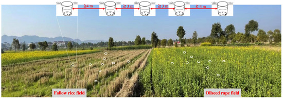 Spiders and carabids in the field were sampled with pitfall traps. In the center of each FR and OSR field, nine pitfall traps were set up with 3 m or 4 m distance in a ‘X’ outline (Figure 2). For each pitfall trap (a 475 mL PET cup, with an upper diameter of 8 cm, lower diameter of 5.5 cm, and 13 cm depth), it was filled by one-third with a mixture of saturated salt water to prevent samples from rotting, and then dishwashing liquid was used to remove the surface tension. The top edge of the pitfall trap was flush with the ground. The center of each sample plot represented results obtained from nine pitfall traps. Sampling was conducted at 10-day intervals during the whole sampling period, i.e., 8 times in 2019 (mid-November to mid-February the following year) and 14 times in 2020 (mid-November to mid-March the following year). After each sampling, traps were emptied and refilled. Pitfall contents were preserved in 75% ethanol, adult spiders and carabids were identified at the species level, and the remaining individuals that could not be identified at the species level were identified at the genus or family level.