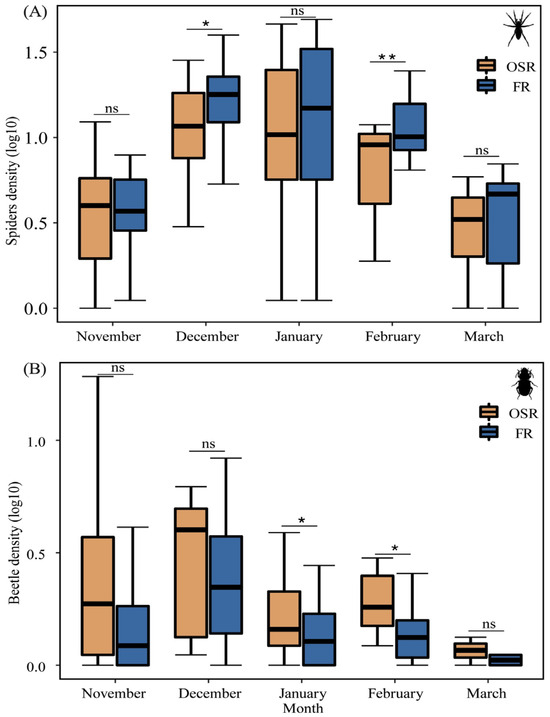 Activity density (mean, log10-transformed) of spiders (A) and carabids (B) in winter FRs (n = 8) and OSRs (n = 8). * p < 0.05, ** p < 0.01, ns is not significant.