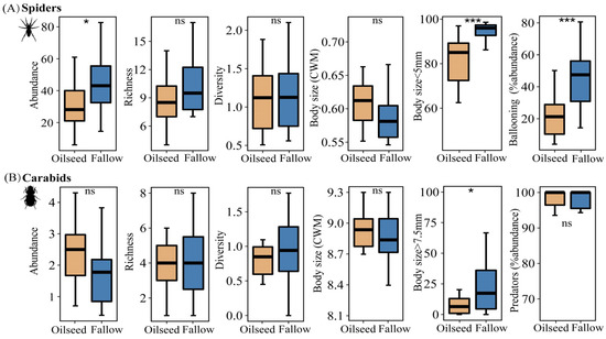 Comparison of the alpha diversity and functional traits of spiders (A) and carabids (B) between fallow rice fields and oilseeds rape fields. In the boxplots, the box represents the interquartile range (25–75%) and the band inside is the median. Differences were tested with a paired t-test or the Kruskal–Wallis test. ns is not significant, * p < 0.05, *** p < 0.001.