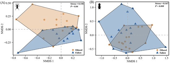 - We performed a non-metric multidimensional scaling (NMDS) ordination based on the Bray–Curtis distance matrix from the relative abundance of all adult species using the “vegan” package in R [49], to visualize the spatial community dissimilarity of spiders and carabids in fallow rice fields and oilseed rape fields. Subsequently, PERMANOVAs (999 permutations) were used to test for significant difference in species assemblages between the oilseed rape fields and the fallow rice fields.