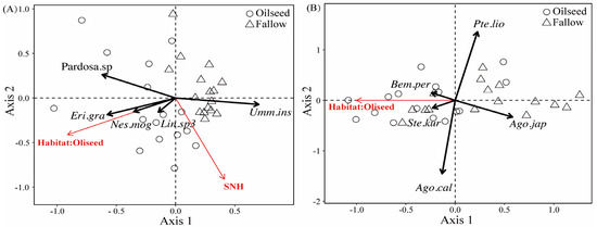 RDA analyses were used to explain the effect of landscape compositions on the spider and carabid assemblages, in which the landscape variables were assessed for a focal central sample field with a radius of 1000 m. The RDA model indicated that the percentage of oilseed rape area positively correlated with several spider species, with the exception being U. insecticeps (F(1,29) = 8.380, p = 0.001, Figure 6A). The U. insecticeps density was positively affected by the proportion of semi-natural habitats (F(1,29) = 2.890, p = 0.023, Figure 6A). The individual density of three carabid species (Bembidion perditum (Netolitzky), Stenolophus kurosai (Tanaka), and A. chalcomus) was positively related to the proportion of OSR. Conversely, P. liodactylus and Agonum japonicum (Motschulsky) individuals were negatively affected by the proportion of OSR (F(1,30) = 2.430, p = 0.001, Figure 6B).