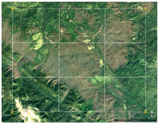 Satellite image (Google Maps, https://www.google.com/maps, accessed on 15 July 2023) of the study area within the boundaries (54°45′–55°05′ N, 95°20′–99°10′ E) after the 2019–2020 Siberian silk moth D. sibiricus outbreak.