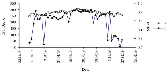 Typical time dependence of indices: 1. NDVI, 2. LST. Pixel coordinates: 95.59687 and 54.87187; fir forest, control, year: 2014.