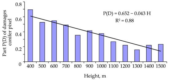 From Figure 5, it follows that with increasing altitude, the susceptibility of trees to a pest attack decreases linearly and that . It should be noted that for mountain forest stands of Siberia, the average air temperature decreases by 5 °C with an increase in altitude by 1 km [71].