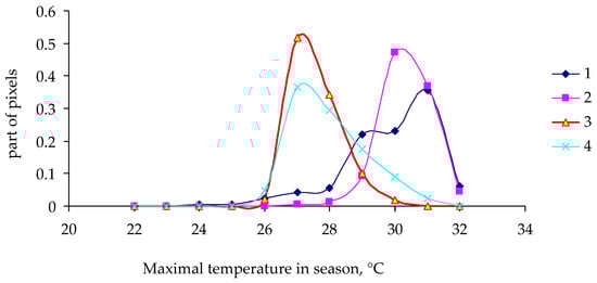 As one can see in Figure 6 and Figure 7, the shape of the distribution density function (dependence on maximal temperature in a pixel) differs little between damaged and undamaged forest stands in 2014 and in 2017. For the year 2018, the distribution density function for undamaged stands is slightly shifted to the region of lower temperatures, whereas for 2019 (the year of onset of visible damage to tree crowns), the functions of the density of distribution of pixels by maximal temperature were not much different between damaged and undamaged forest stands.