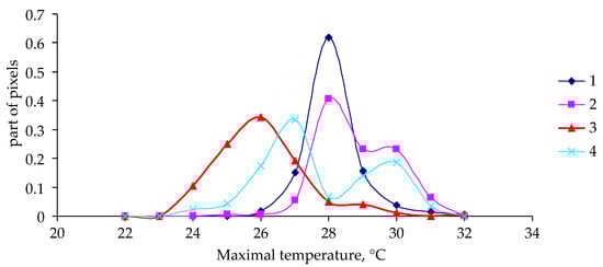 Temporal changes in the maximum temperature pixel’s temperature distribution function were analyzed for the period of 2014–2021. 1: Data from attacked forest stands; 2: data from unattacked stands.