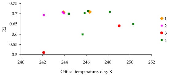 Before the outbreak, the coefficient of determination R2 was close to 0.7 both in pixels of the outbreak zone and in pixels of the control area, where T0 (in degrees Kelvin) was no less than the critical value of Tc = 244 K. For zones of the already developed outbreak of the pest, the coefficient of determination R2 declined to 0.6, and the value of T0 became less than 244 K.