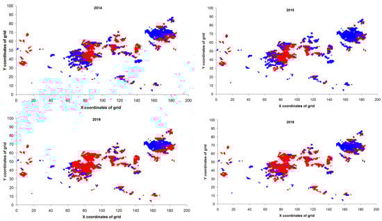 The spatial distribution of U values for the outbreak zone in the year 2019 and at a different years before the outbreak. Red dots: U = 0; Blue dots: U = 1.