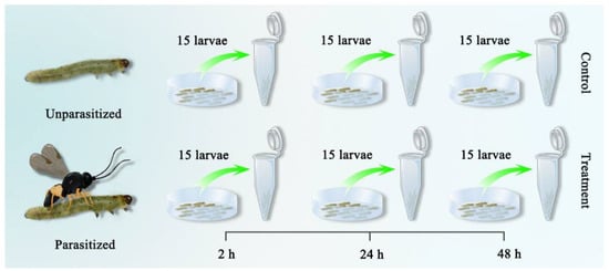 The emerged wasp adults within 24 h were collected and fully mated for 24 h followed by parasitizing the FAW first instar larvae for 2 h with a wasp/host ratio of 1:5. Subsequently, we removed the wasps and maintained the parasitized host larvae according to the above conditions. Fifteen parasitized FAW larvae at 2 h, 24 h, and 48 h post-parasitization were served as the experimental groups, and samples from 15 same-aged unparasitized host larvae were used as the control groups. Each group was repeatedly sampled thrice. All samples were collected into a centrifuge tube with 1 mL TRIzol Reagent (Invitrogen, Carlsbad, CA, USA) and fully ground in liquid nitrogen for subsequent RNA extraction.