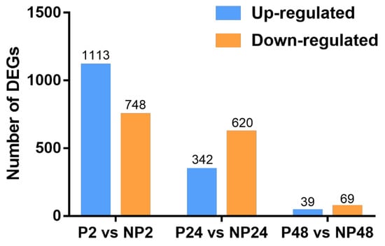 Identification of DEGs between the unparasitized and parasitized FAW larvae. Numbers of DEGs identified from the P2 vs. NP2, P24 vs. NP24, and P48 vs. NP48 groups. The upregulated and downregulated DEGs were presented in the blue and orange columns, respectively.