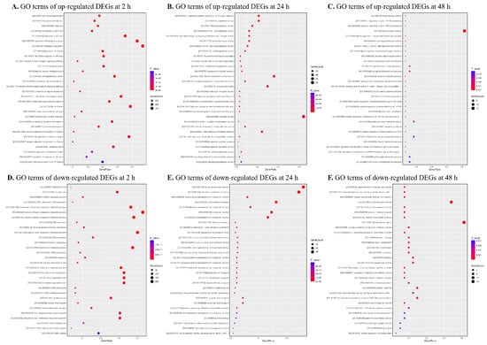 GO functional categories of DEGs obtained from the comparisons of P2 (A) vs. NP2 (D), P24 (B) vs. NP24 (E), and P48 (C) vs. NP48 (F) groups. The rich factor represents the ratio of DEGs in a certain GO category. The size and color of the dots, respectively, indicate the range of gene count and p-value mapped to the corresponding terms.