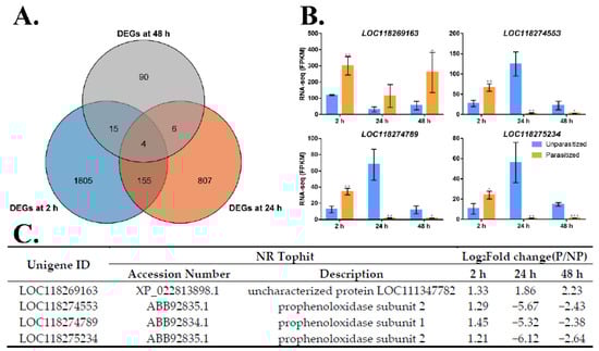 Identification of common DEGs at 2 h, 24 h, and 48 h post-parasitization with M. manilae. (A) Venn diagram of DEG numbers between unparasitized and parasitized FAW larvae at 2 h, 24 h, and 48 h. (B) The comparisons of FPKM in four common DEGs between unparasitized and parasitized host larvae and data were presented as mean ± SE (n = 3). (C) List of the four common DEGs and their functional annotations in the NR database.