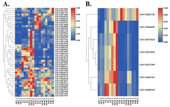 Expression profiles of DEGs involved in host metabolism and immunity. (A) Expression profiles of metabolism-related genes in host FAW upon M. manilae parasitization. (B) Expression profiles of immune-related genes in host FAW upon M. manilae parasitization. The higher and lower expression levels are respectively shown in red and blue colors based on the log2(FPKM) values.