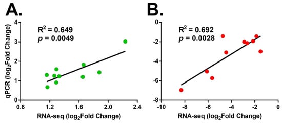 In the final part of the analysis, we validated the accuracy and reproducibility of the expression patterns of DEGs generated from the RNA-sequencing, 10 upregulated and 10 downregulated DEGs involved in host metabolism and immune were randomly selected for qPCR analysis that were expressed diversely in response to parasitization (Figure 6A,B). qPCR results indicated that the upregulated DEG expression levels showed a 1.59–8.09-fold increase post-parasitization with M. manilae (Figure 6A). In parallel, there were remarkable decreases in mRNA levels (0.008–0.38-fold) of several DEGs in M. manilae parasitized host (Figure 6B). Furthermore, the Pearson correlation analysis validated that there were significant positive correlations between the log2 Fold change (FPKM) values and log2 Fold change(qPCR) values in both upregulated (R2 = 0.645, p = 0.0049) and downregulated DEGs (R2 = 0.692, p = 0.0028).